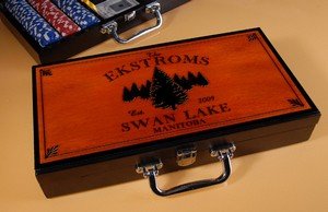 A complete poker set packed in a personalized case with your choice of cabin d?cor themes Take your favorite game on the road or remember your favorite escape each time you ante up with our Spruce Cabin Personalized Poker Set. Includes everything for the perfect game - 300 11.5 gram clay composite chips, five dice, two decks of cards and one dealer chip - the ultimate personalized gift for any poker fan. The ideal gift for the nature lover. The black case is made of durable composite wood and features your choice of cabin images. Personalized with last name, locations and established date - each line accommodates up to 20 characters.