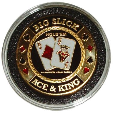 Among the four strongest starting hands in Texas Hold'Em is Ace/King ("Big Slick"). We have reproduced this hand in a shiny gold brass coin. The attractive artwork is color-detailed on 1? " diameter and each piece is HAND PAINTED, giving it a one-of-a-kind quality. The coins come packaged with colorful graphics and are encased in a plastic cover to keep the coin in perfect condition as you use it while playing poker. Hold'Em, Omaha, Stud and other poker players can use this product to secure their cards during play. When not actively looking at their hand cards, players must place them face down on the table in front of their chips. Positioning the coin over the cards protects them from being accidentally exposed, fouled or folded.